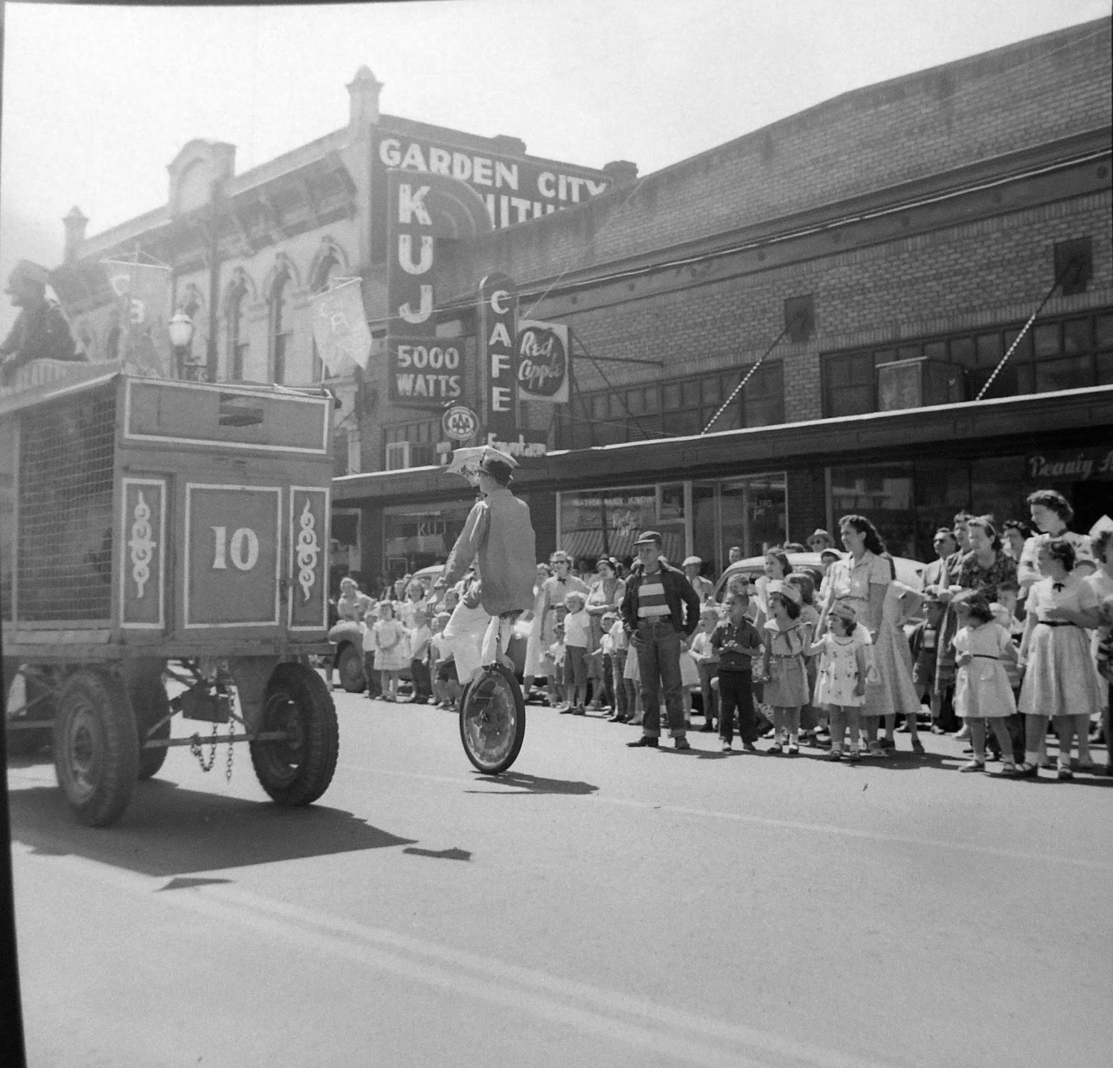 | Kids parade on Spokane Street by Hunt & Lindstrom auto repair in Keen Bldg next to Keen Apts |